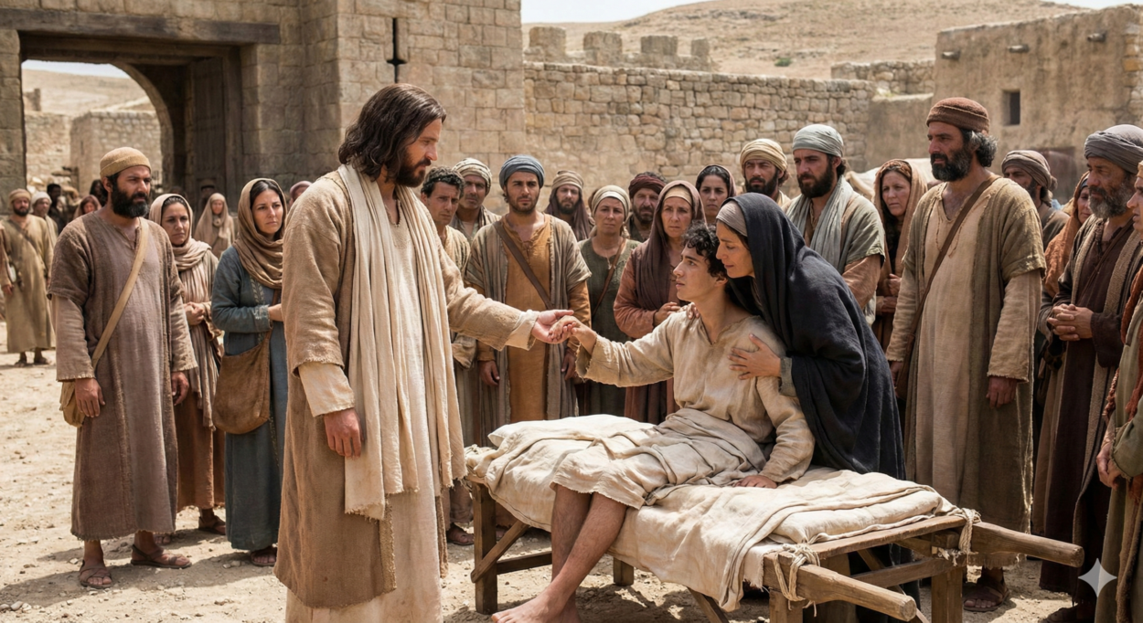 Jesús, que llegaba de Capernaum con un gran grupo de seguidores, se encontró en la entrada de la ciudad con esta caravana mortuoria, la cual estaba llevando el cuerpo de aquel joven a las afueras de la ciudad, para ser sepultado. Ambos grupos se detuvieron y como lo establecía la tradición, aquellos que venían con Jesús, no sólo cedieron el paso, sino que se dispusieron a acompañar a los dolientes como un acto de consideración y respeto a los familiares y amigos del que habría partido. Gritos, lamentos, el sonido de algunos instrumentos y oraciones continuas llenas de dolor, eran los sonidos que cargaban el ambiente de aquella tristísima hora.